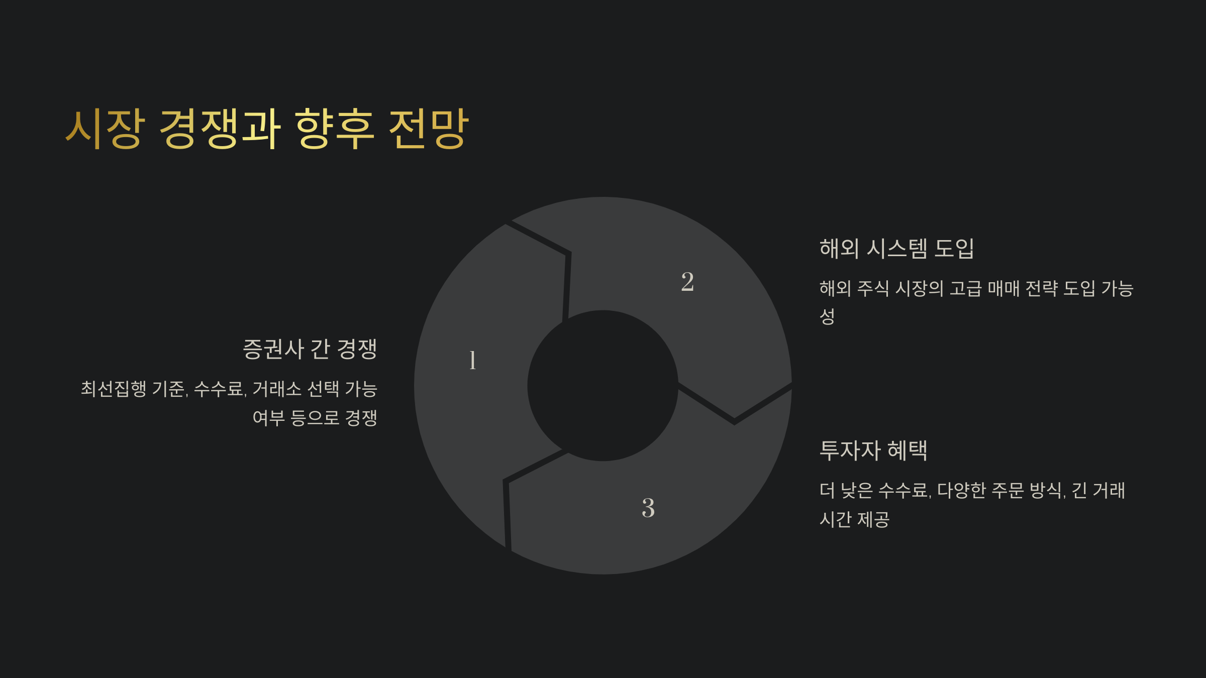 - 투자자 혜택 증가: 거래 수수료 절감, 다양한 주문 방식 도입 등 투자자들에게 더 유리한 조건이 만들어질 수 있어요.
