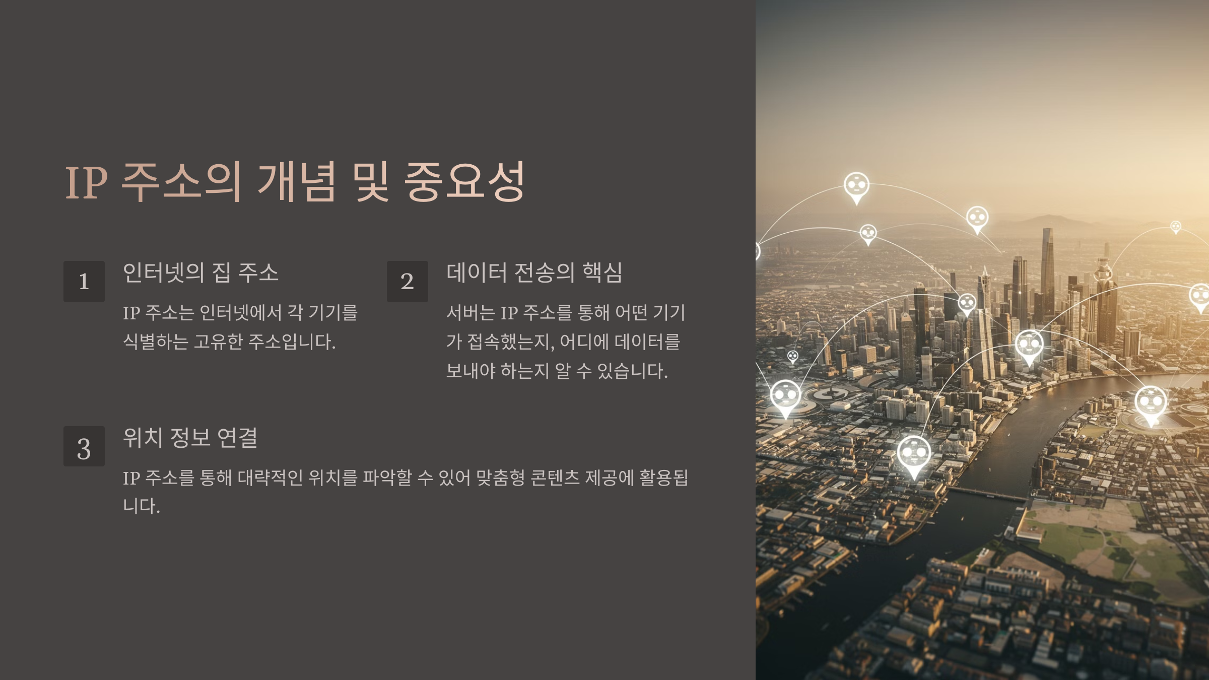 IP 주소는 인터넷 세상에서 우리 집 주소와 같아요. 편지를 보내려면 정확한 주소가 필요하듯이, 인터넷에서 데이터를 주고받으려면 각 기기를 식별할 수 있는 고유한 주소가 필요한데요, 그게 바로 IP 주소랍니다. IP 주소가 없다면 인터넷은 마치 주소 없는 도시처럼 혼란스러워질 거예요.