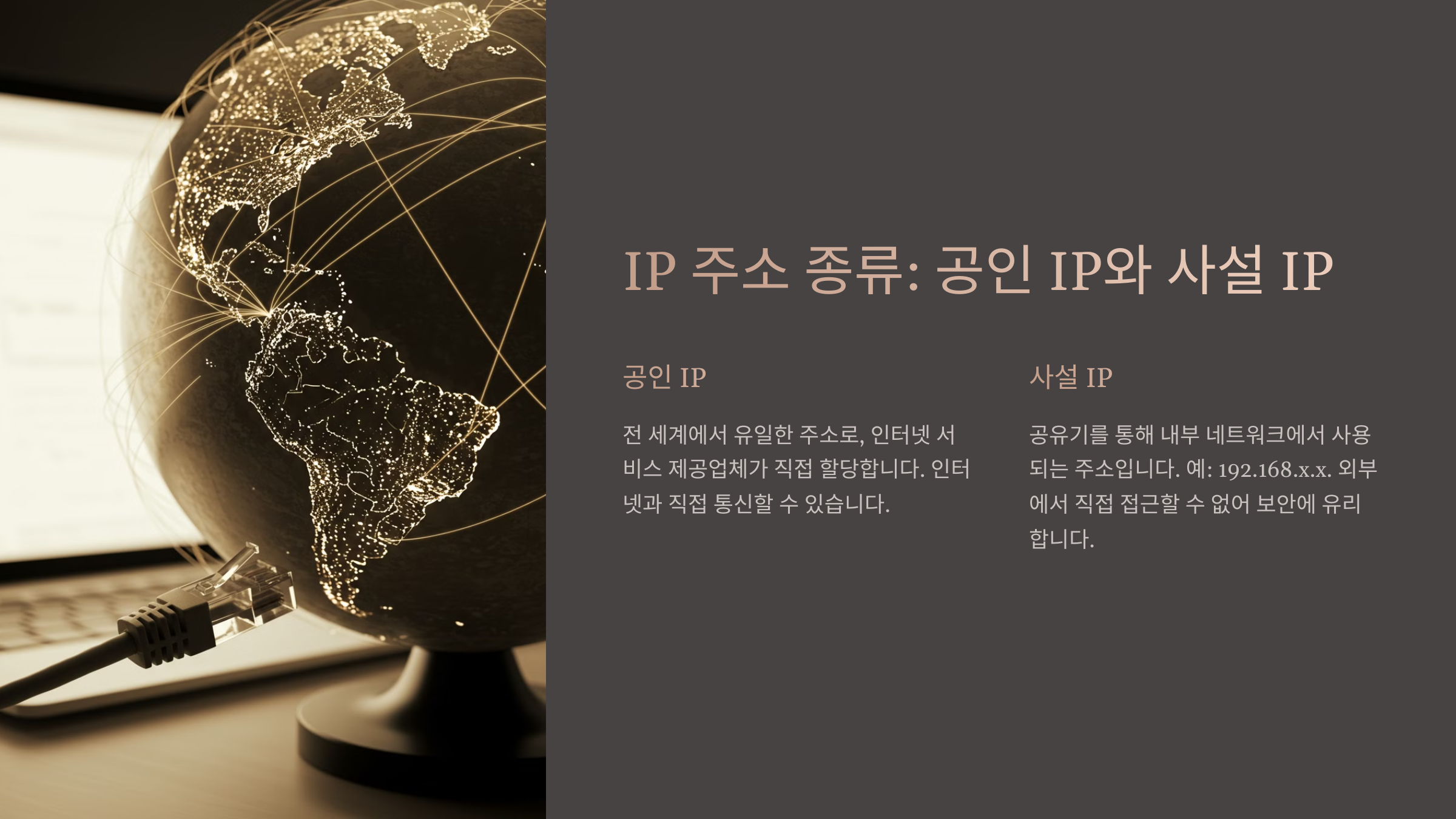A : 공인 IP는 전 세계에서 유일한 주소로, 인터넷 서비스 제공업체가 직접 할당합니다. 반면, 사설 IP는 공유기를 통해 내부 네트워크에서 사용되는 주소로, 외부에서 직접 접근할 수 없습니다.