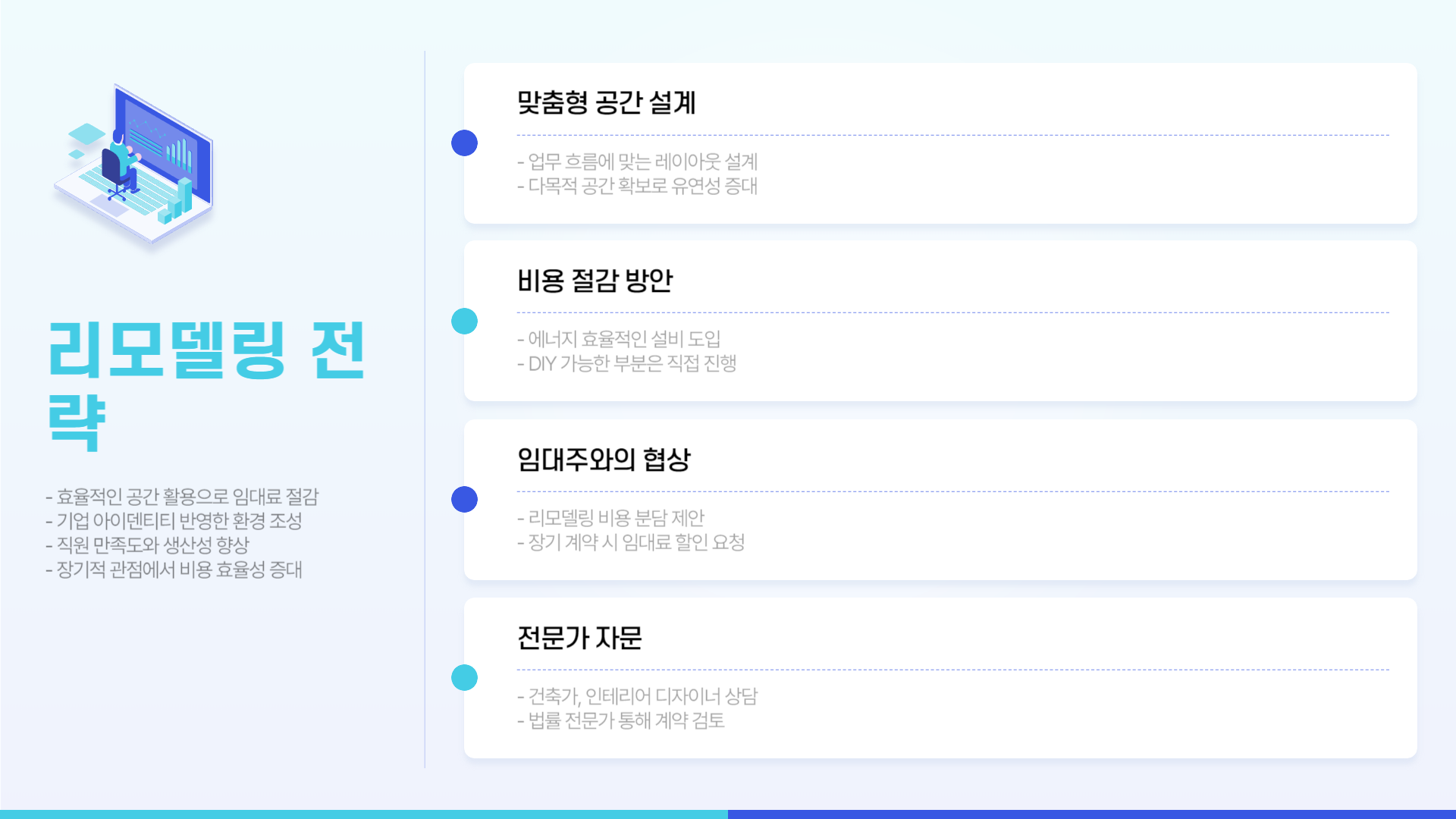 임대료가 높은 지역에서 작은 공간을 임대한 후 리모델링을 통해 최적화된 사무 공간을 만드는 것도 효과적인 전략입니다. 초기 비용은 다소 발생하지만, 맞춤형 공간 설계는 장기적으로 임대료 대비 높은 가치를 제공합니다. 이를 통해 기업의 아이덴티티를 반영한 공간을 구축하고, 업무 효율성을 극대화할 수 있습니다.