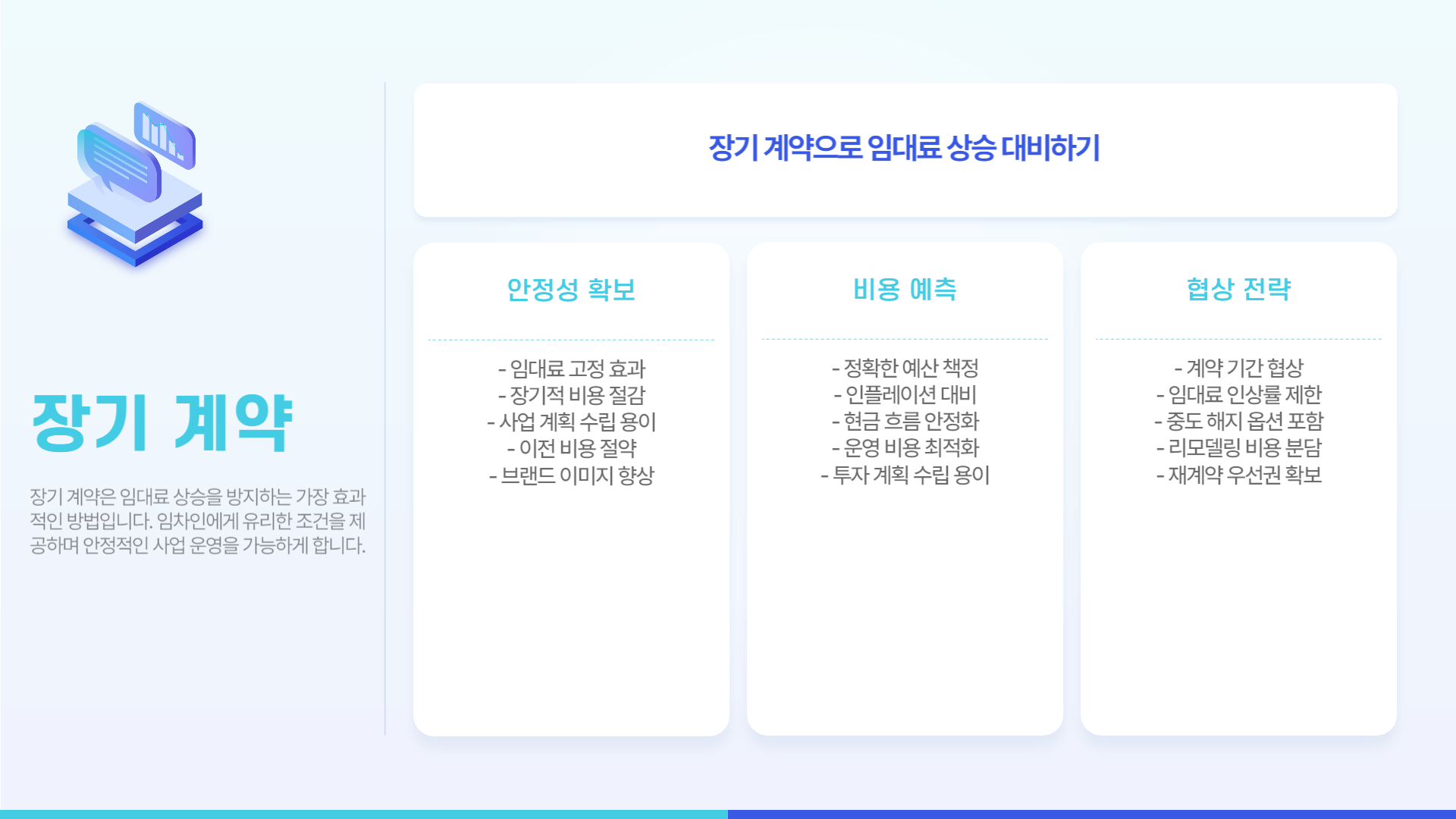 💡 Tip: 장기 계약을 고려할 때에는 계약 종료 시점의 옵션을 충분히 협상하여 유연성을 확보하세요. 예를 들어, 3~5년 계약을 체결하면서도 조기 종료 시 위약금을 최소화하는 조항을 삽입할 수 있습니다. 이를 통해 장기적인 안정성과 단기적인 유연성을 동시에 확보할 수 있습니다.