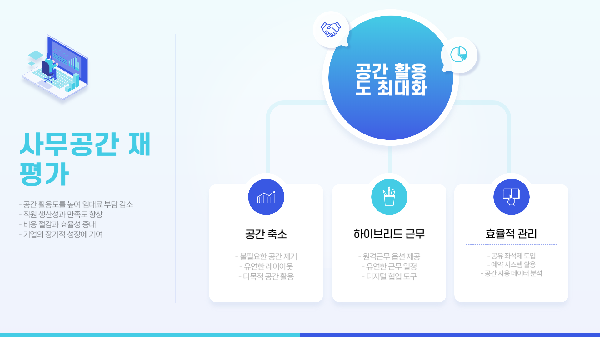 모든 기업이 대규모 사무 공간을 필요로 하지는 않습니다. 공간 활용도를 최대화하고 필요 이상의 면적을 줄이는 것은 비용 절감에 직접적인 영향을 미칩니다. 특히 하이브리드 근무제를 도입하면 사무실 공간에 대한 의존도를 크게 줄일 수 있습니다. 많은 기업이 유연 근무제를 통해 직원들의 생산성을 유지하면서도 공간 임대료를 절감하고 있습니다.