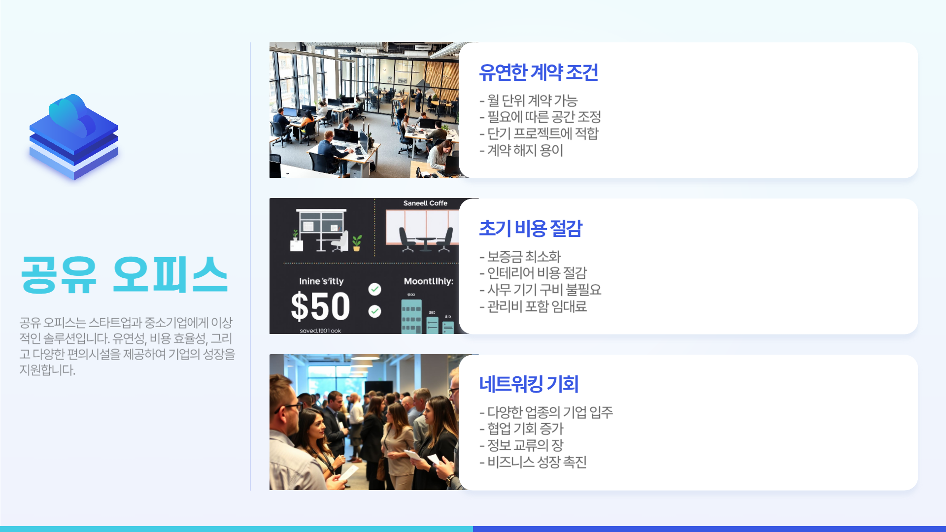 공유 오피스는 스타트업과 소규모 기업에게 특히 적합한 옵션으로, 초기 비용 부담이 적으면서도 필요에 따라 쉽게 확장할 수 있습니다. 이러한 공간은 월 단위 또는 시간 단위의 계약이 가능하므로, 기존 임대보다 훨씬 유연합니다. 또한, 전용 사무 공간과 공용 공간이 조화를 이루어 업무 환경을 최적화할 수 있습니다.