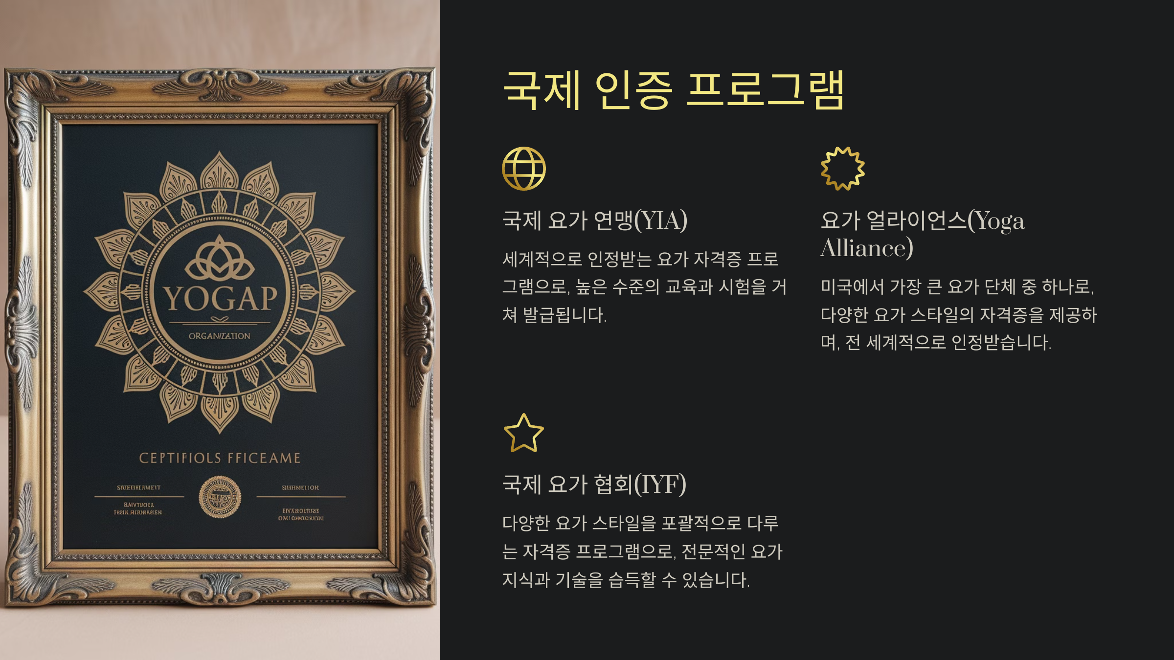 국제 인증 프로그램은 전 세계적으로 통용되는 자격증을 취득할 수 있는 과정이에요. 가장 대표적인 기관은 Yoga Alliance로, RYT(Retistered Yoga Teacher) 인증을 제공해요. RYT는 전 세계적으로 인정받는 표준 자격증이랍니다.
