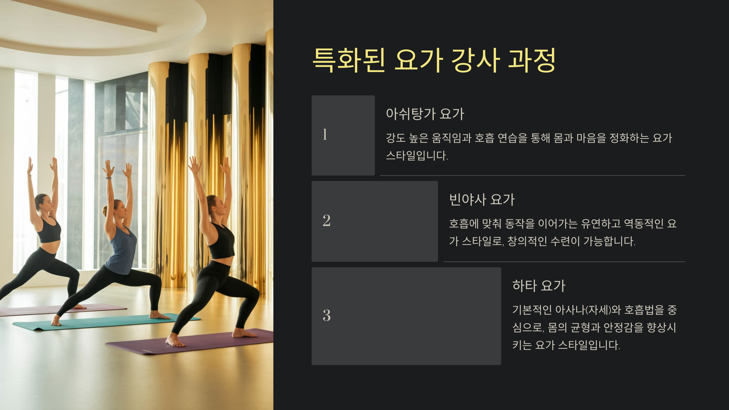 1. 요가 아사나 지도: 주요 요가 동작의 올바른 수행법과 지도법을 배워요. 동작의 변형, 안전한 지도 방법도 함께 익히게 돼요.