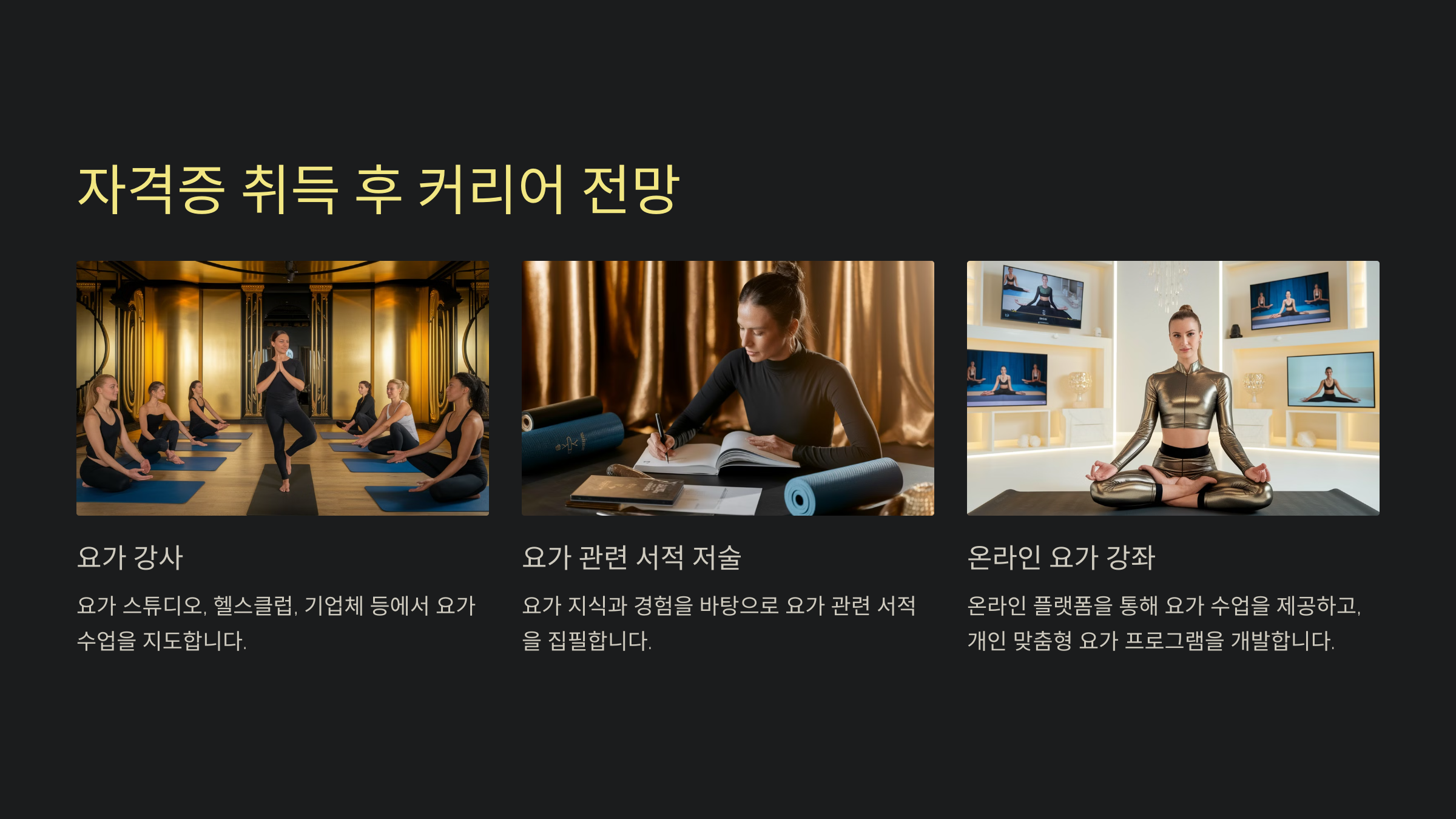 국내에서도 다양한 자격증 프로그램이 운영되고 있어요. 한국직업능력연구원에서 인증받은 민간 자격증부터 요가 협회에서 발행하는 자격증까지 다양해요. 국내 자격증은 주로 한국 내에서 활동하고자 하는 분들에게 실용적이죠.
