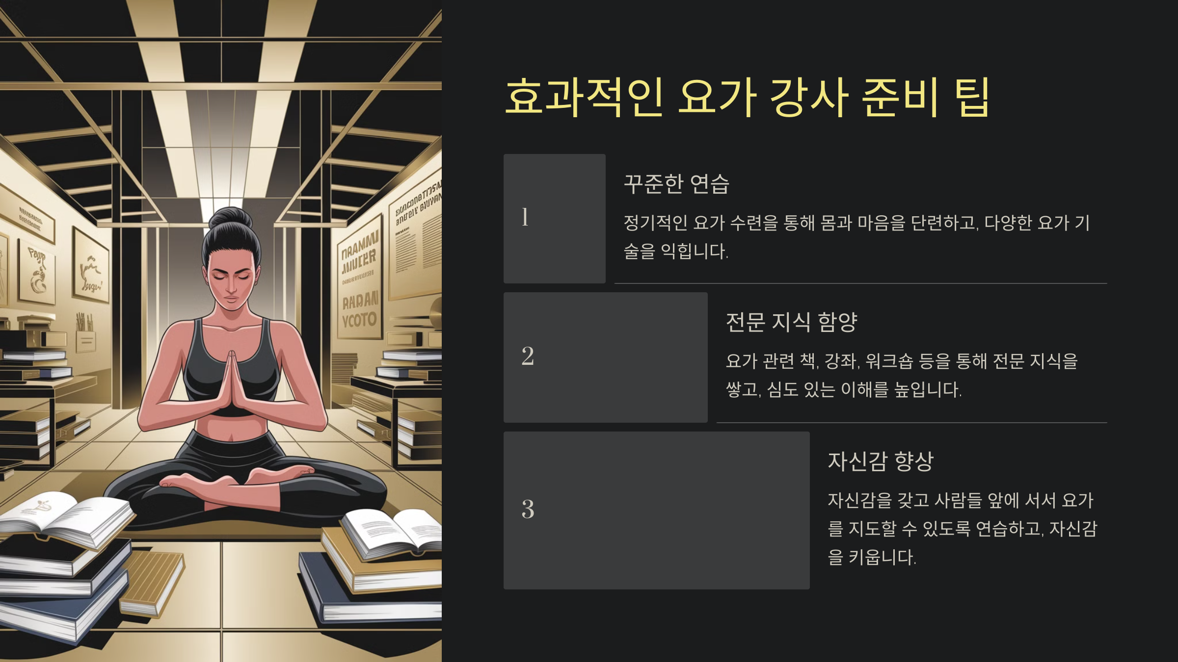 마지막으로, 소통 능력과 열정도 중요해요. 요가는 단순한 운동이 아니라 수강생과의 교감을 통해 심신을 치유하고 성장시키는 과정이에요. 그렇기 때문에 수강생과 잘 소통하고, 그들의 니즈를 파악해 수업을 유연하게 진행할 수 있는 능력을 키우는 것이 필요하답니다.