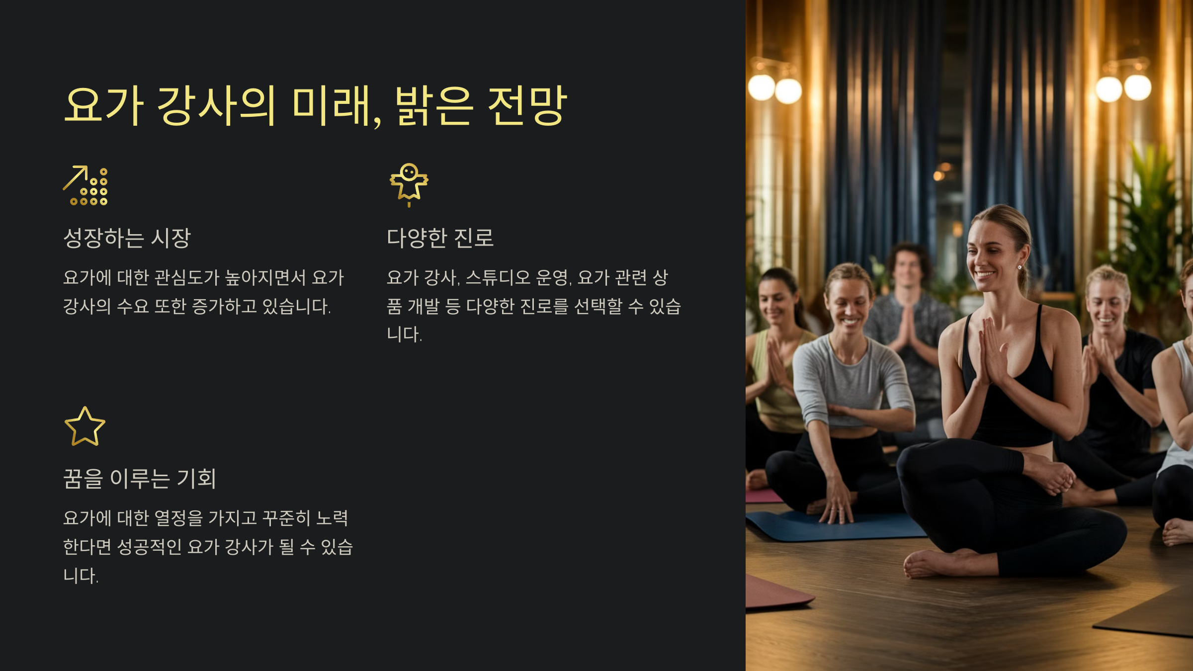 또한, 요가 강사는 웰빙과 관련된 다양한 분야로 확장할 수 있어요. 예를 들어, 요가와 명상을 결합한 프로그램 개발, 웰니스 리트릿 기획, 기업과의 협업 프로그램 등이 가능해요. 요가를 기반으로 창의적인 기회를 만들어가는 것이 요가 강사의 큰 장점이에요.