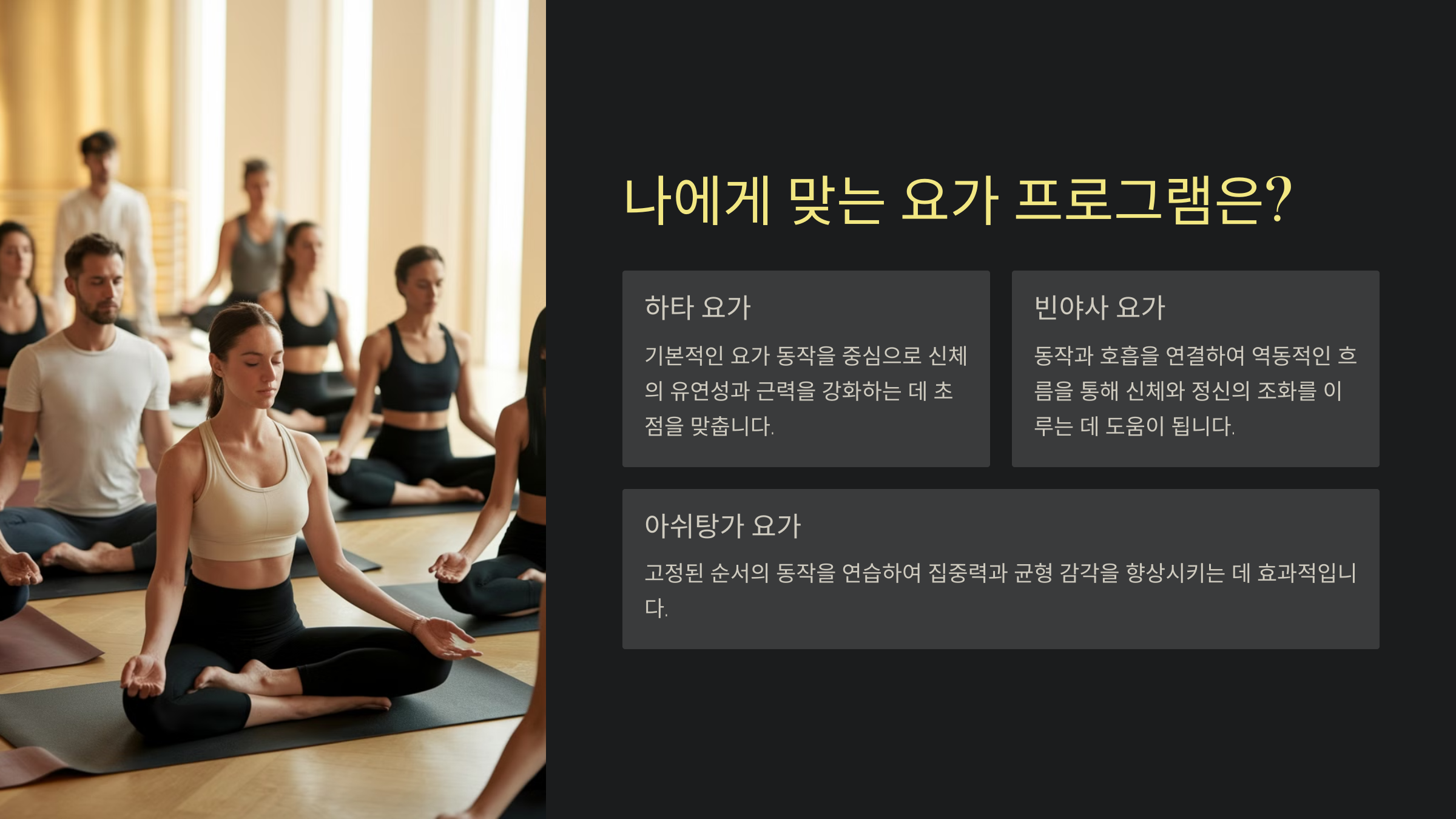 A5. 하타, 빈야사, 비크람 등 다양한 스타일이 있어요. 본인의 관심사와 목표에 따라 선택하는 것이 좋아요.
