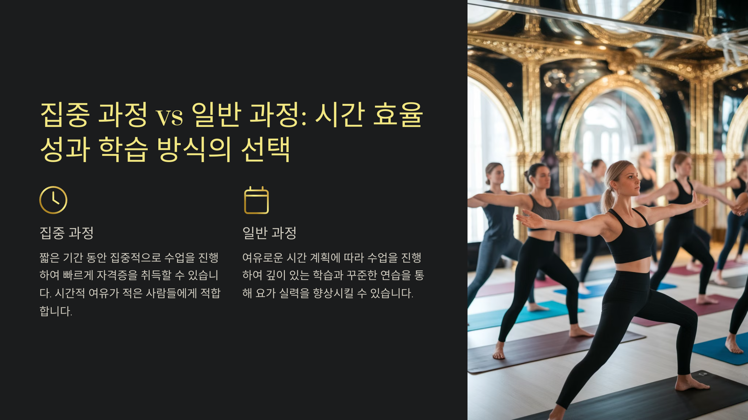 요가 강사 자격증 과정은 집중 과정과 일반 과정 두 가지로 나뉘어요. 각각의 방식은 학습 속도와 교육 경험에 큰 차이가 있어요.