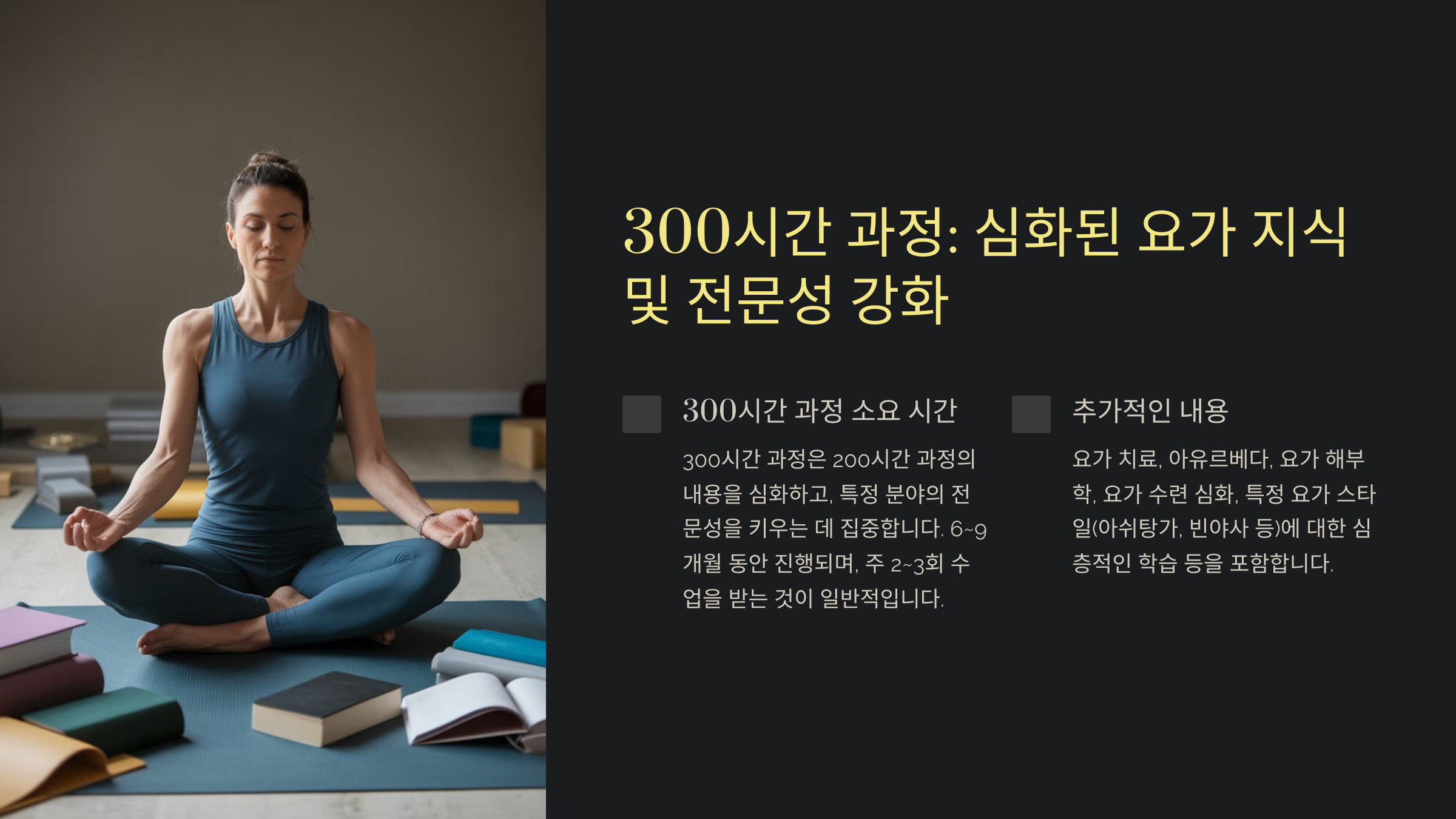 300시간 과정은 200시간 자격증을 보유한 강사를 위한 심화 과정이에요. 이 과정은 더 전문적인 지도법과 심화된 요가 철학, 해부학을 다루며, 소요 기간은 보통 3~6개월이에요. 집중 과정을 선택하면 1~2개월 내에 완료할 수 있어요.