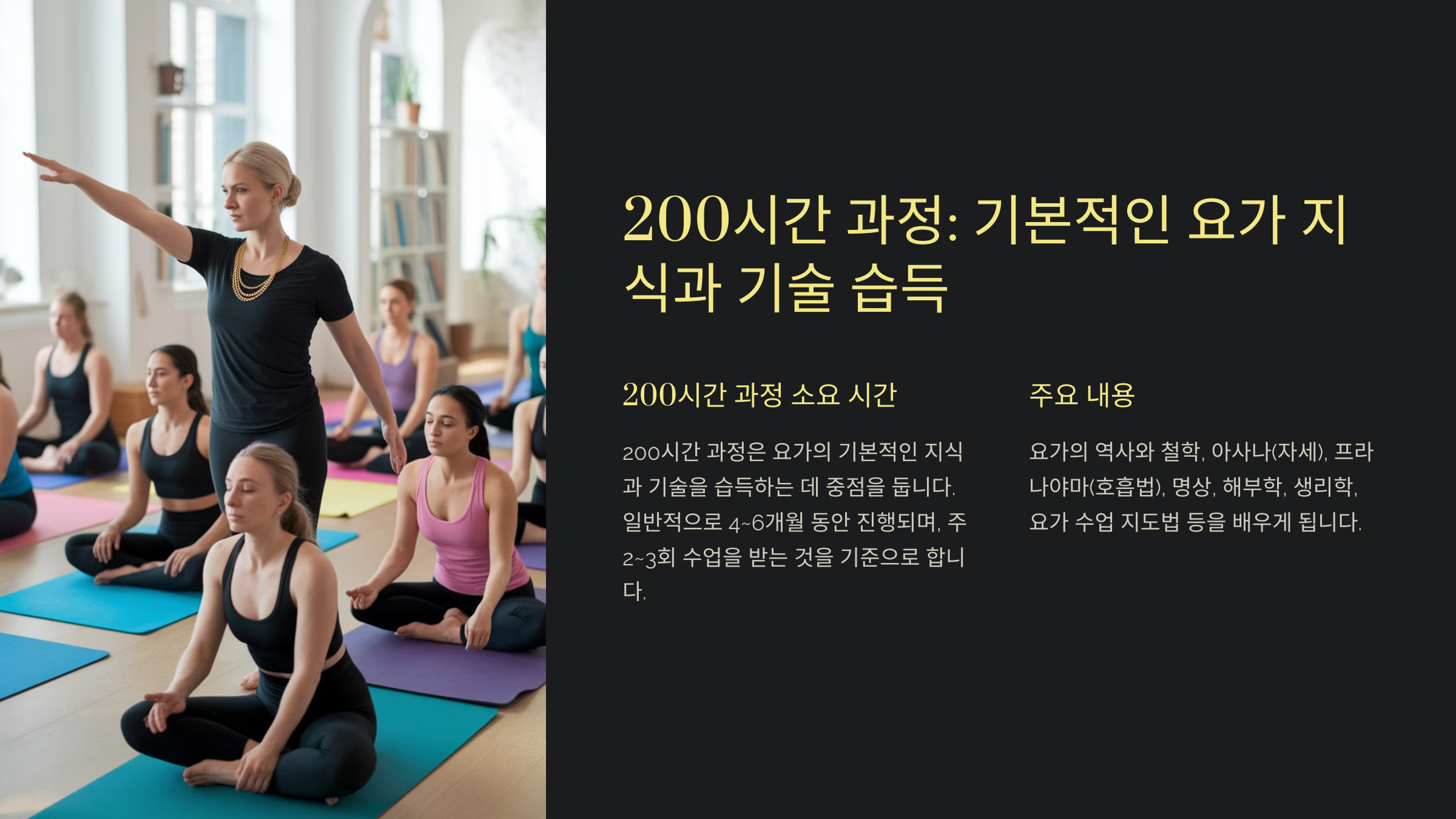 200시간 과정은 요가 강사 자격증의 가장 기본적인 단계로, 초보자를 위한 필수 과정이에요. 이 과정은 보통 2~6개월 정도의 시간이 걸려요. 집중 과정을 선택하면 3~6주 만에 완료할 수도 있어요.