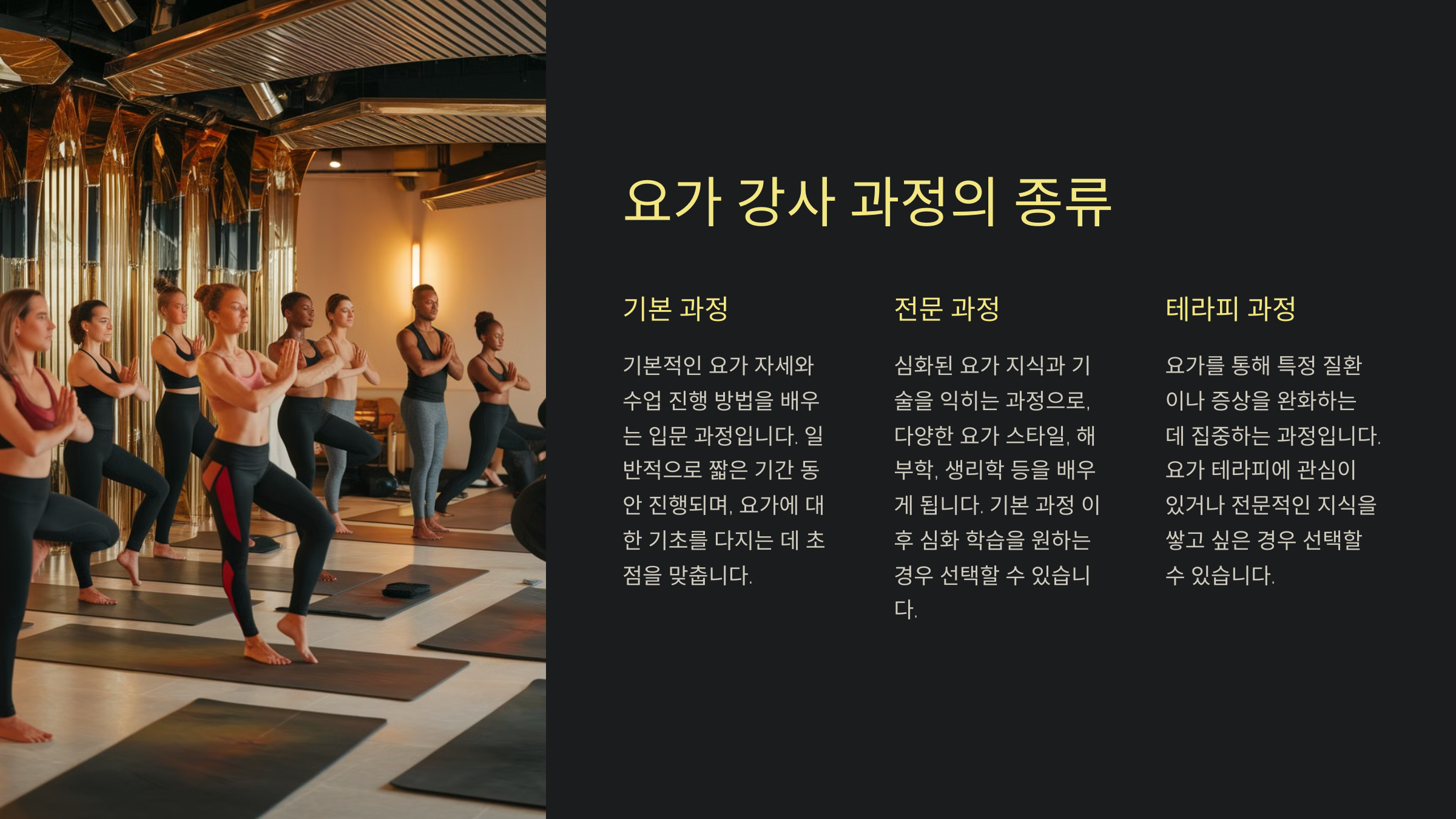 요가 강사 자격증 과정은 크게 초급, 중급, 고급 과정으로 나뉘어요. 초급 과정인 200시간 인증 프로그램(흔히 RYT 200)은 요가 강사로서의 기본적인 지식을 배우는 단계로, 가장 보편적인 과정이에요. 이 과정의 비용은 대략 300만 원에서 500만 원 정도예요.