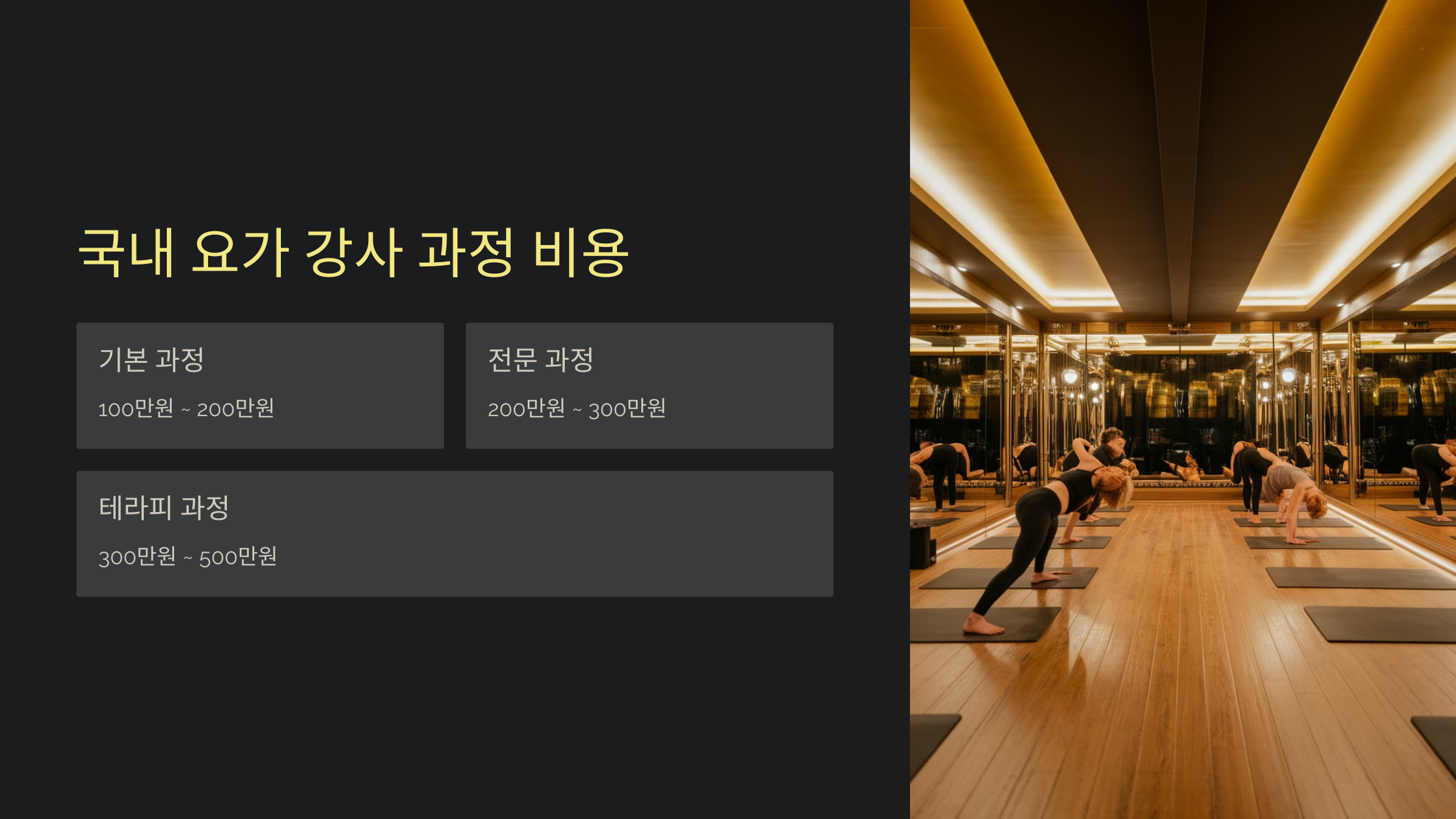 국내에서 진행되는 요가 강사 자격증 과정은 국제 인증보다 비용이 상대적으로 낮은 편이에요. 보통 200시간 기본 과정은 약 100만 원에서 300만 원 정도이며, 국내 요가 협회에서 인증한 과정이 주를 이루어요.