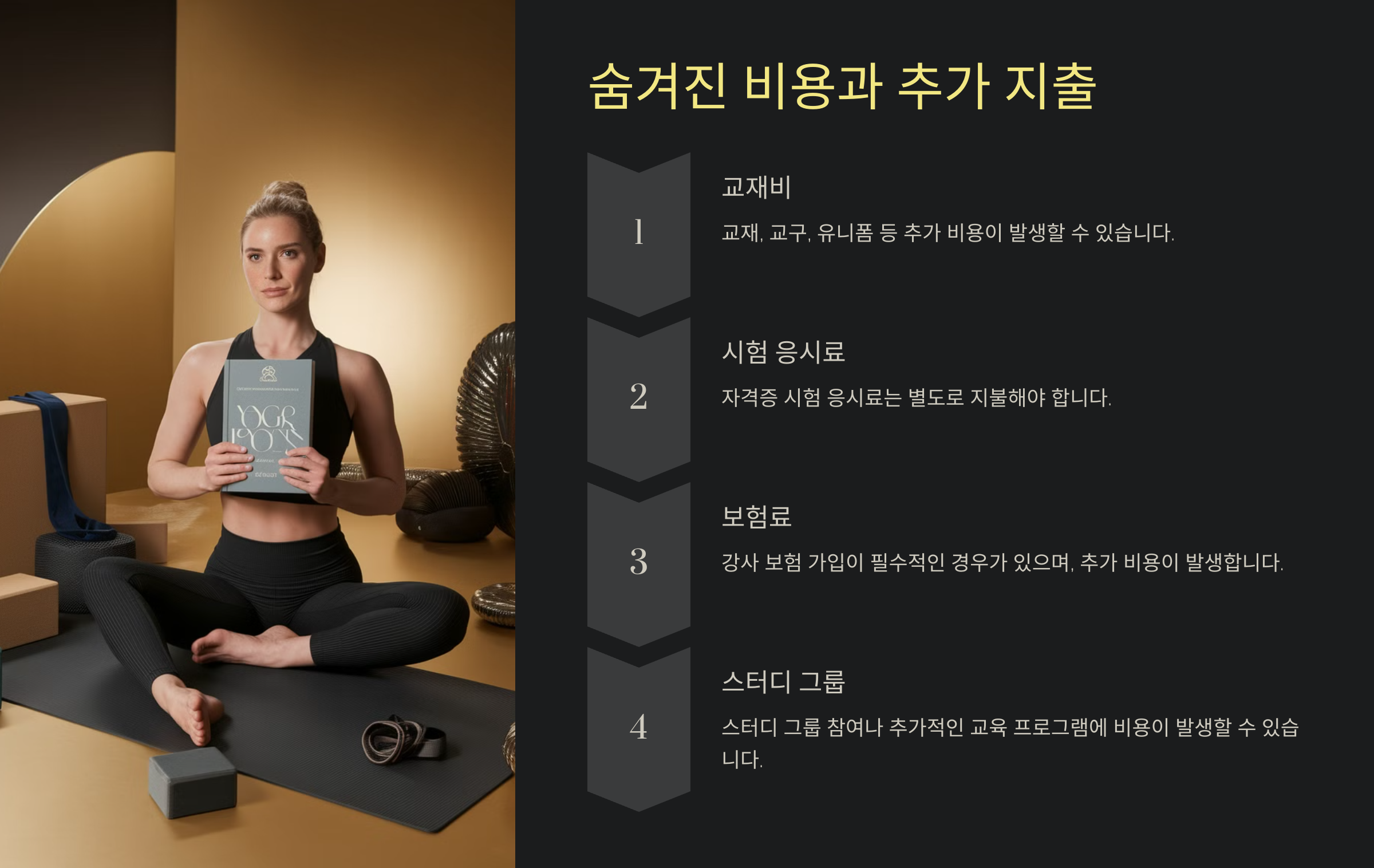 요가 강사 자격증을 취득할 때, 표면적으로 보이는 비용 외에 추가적으로 발생할 수 있는 비용을 고려해야 해요. 대표적인 예로는 실습 비용, 개인 요가 매트와 소도구 구매 비용, 워크숍 참가비 등이 있어요.