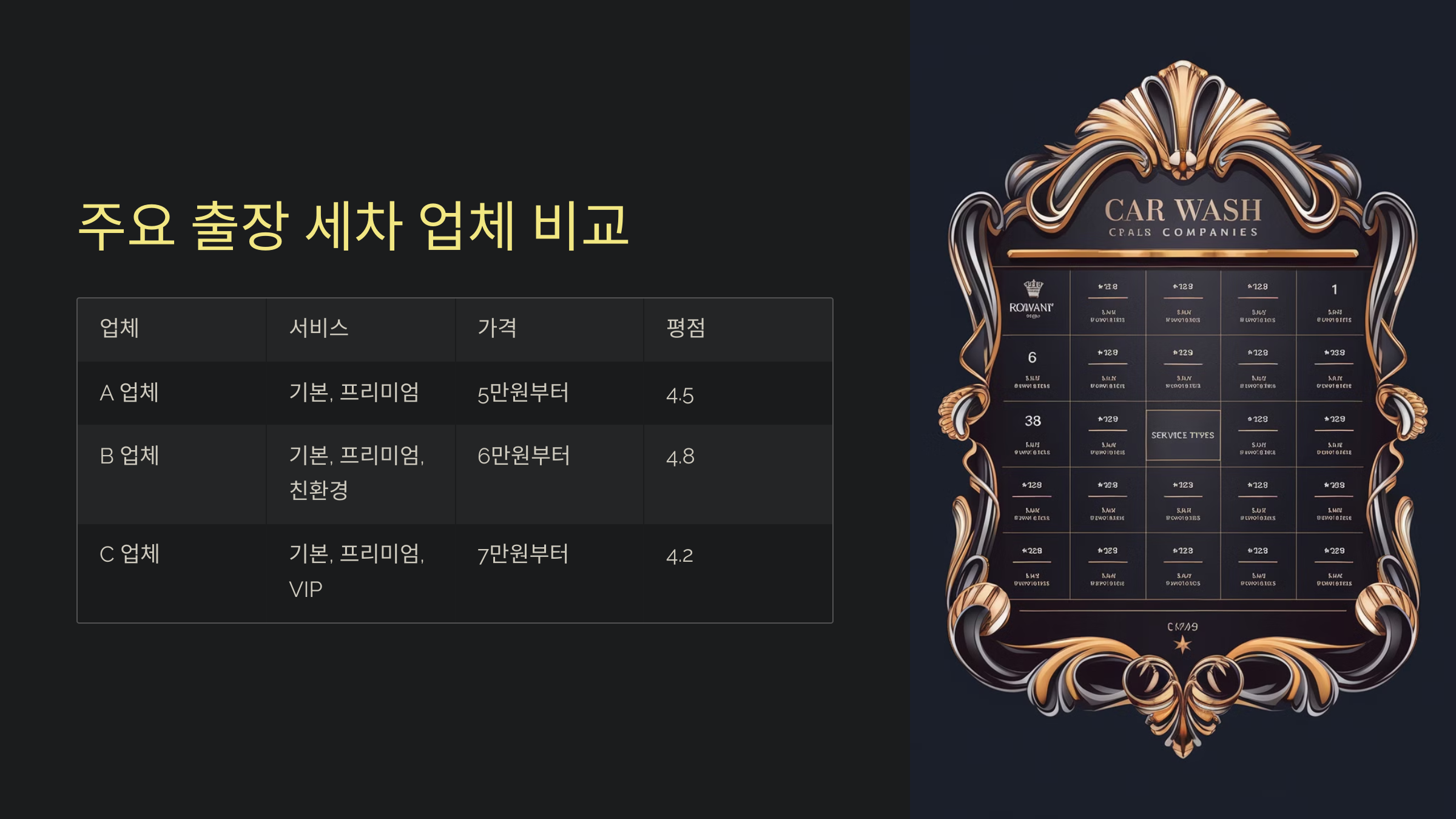 국내 출장 세차 서비스를 제공하는 주요 업체 몇 곳을 비교해볼게요. 각 업체의 특징과 강점을 확인해 자신에게 맞는 서비스를 선택해 보세요.