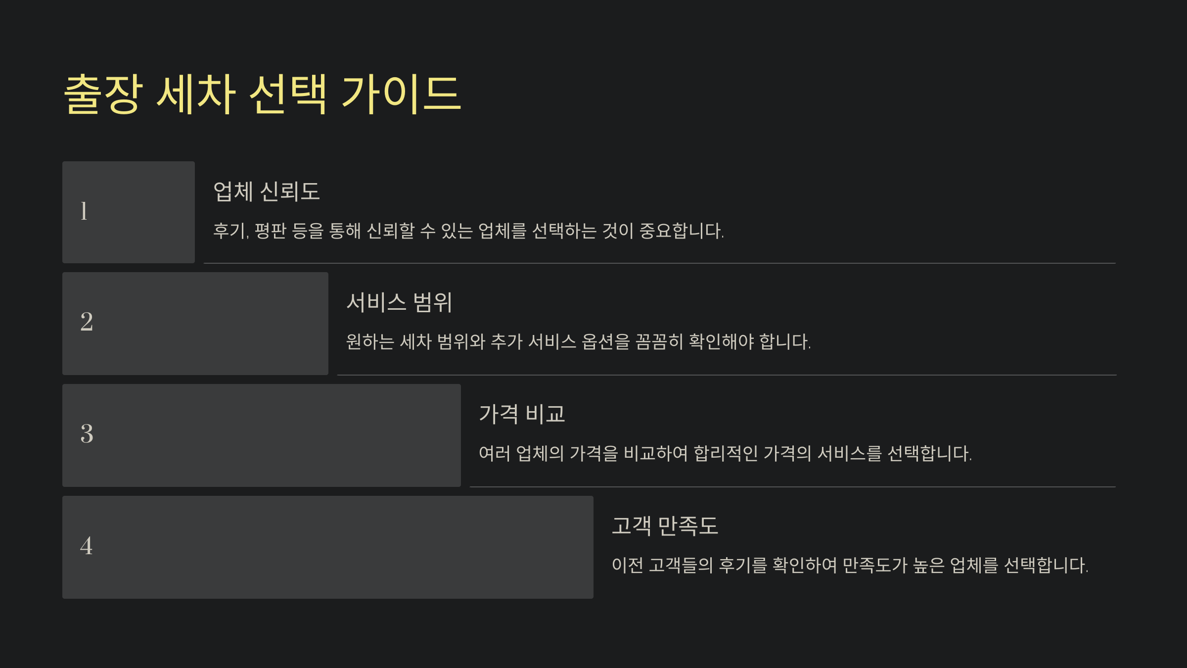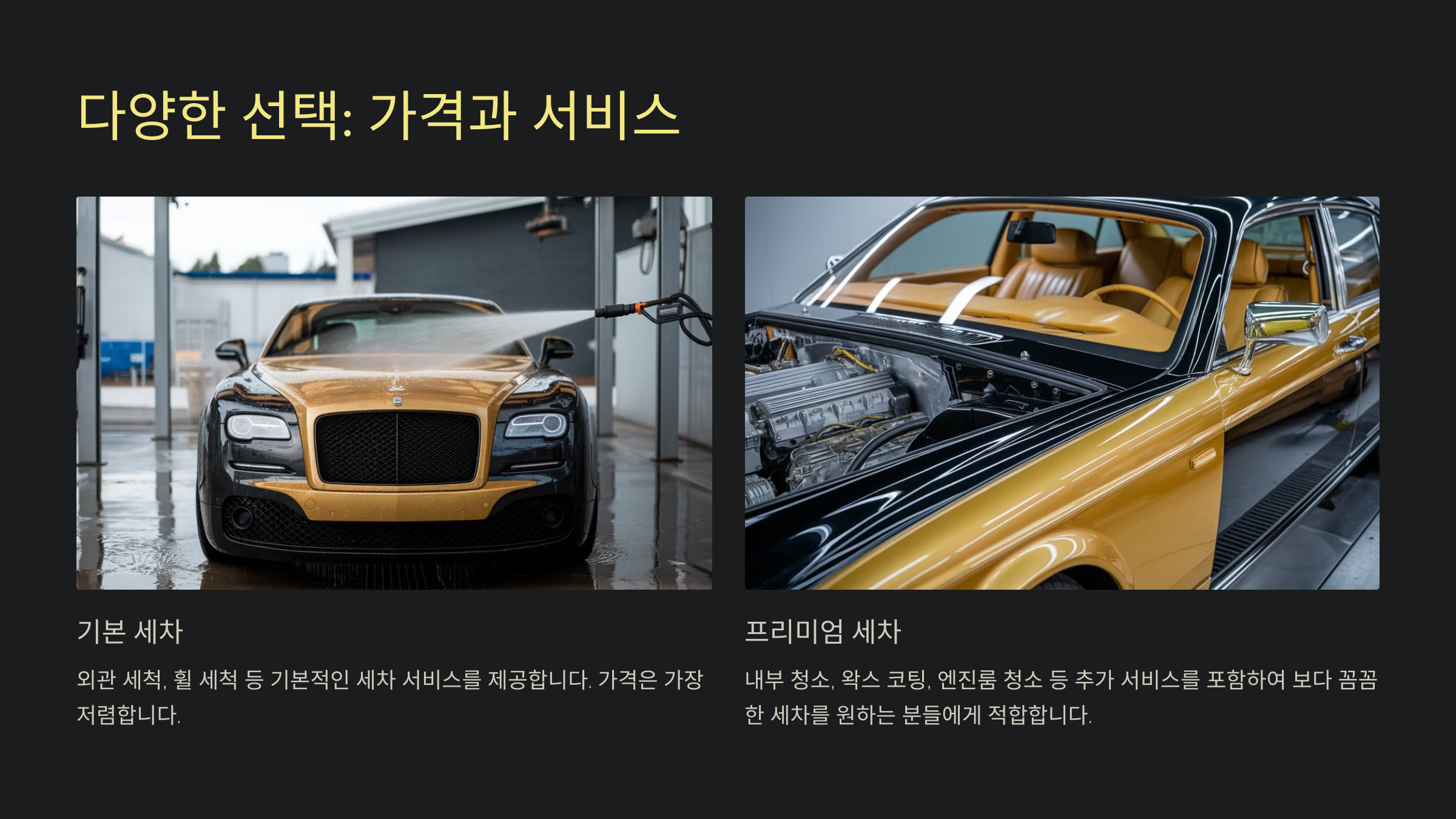 가격 외에도 예약 시스템의 편리성, 정시 도착 여부, 그리고 세차 후 피드백 반영 같은 서비스 품질을 따져보는 것도 중요해요. 비용 대비 만족도를 높이기 위해 업체별 차별화된 혜택을 비교해 보세요.