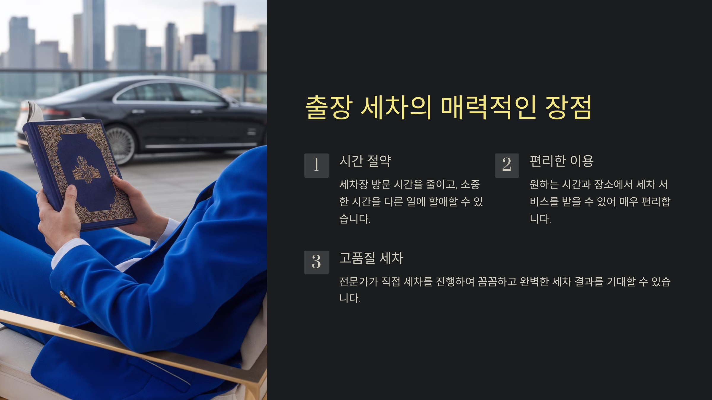출장 세차의 가장 큰 장점은 시간과 편리함이에요. 고객이 세차장을 방문할 필요 없이, 원하는 장소에서 서비스를 받을 수 있답니다. 이는 바쁜 일정을 가진 사람들이나 이동이 불편한 고객들에게 특히 유용해요.