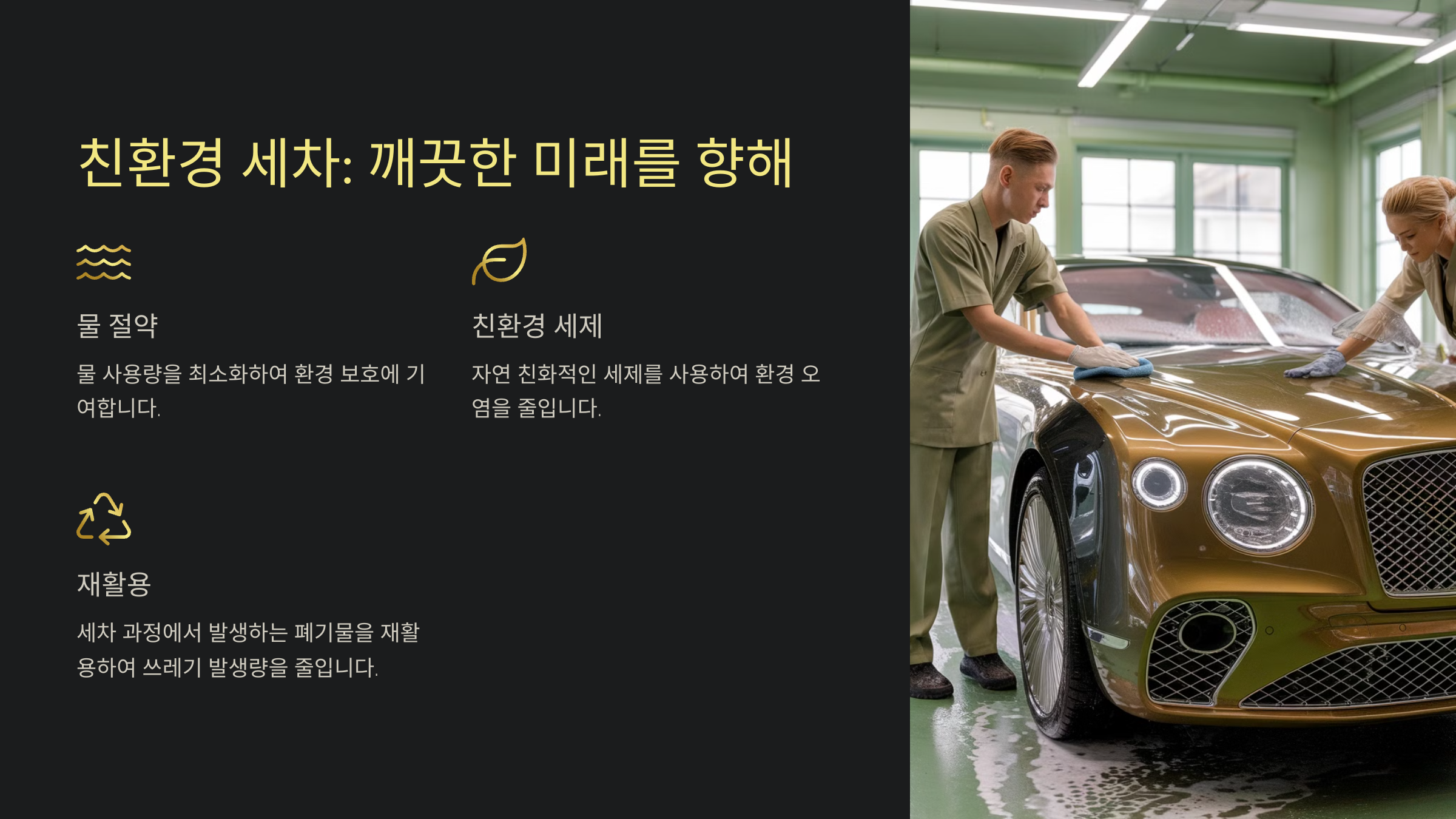A3. 친환경 세차는 물 소비를 줄이고 생분해성 세정제를 사용해 환경 영향을 최소화하는 방식이에요. 차량에도 더 안전한 경우가 많답니다.