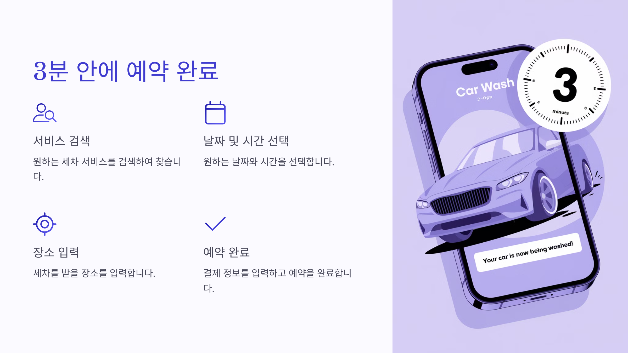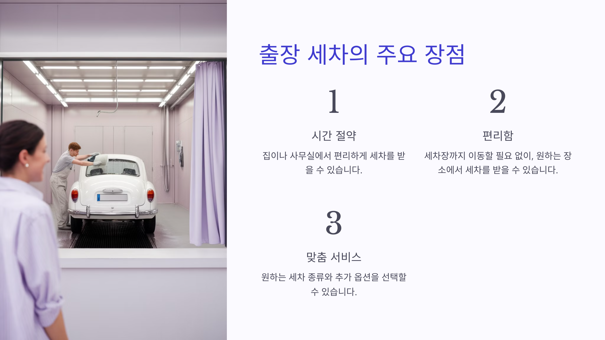네 번째로는 편의성이에요. 업무 중, 집에서 쉬는 중, 쇼핑하는 동안에도 세차 서비스를 받을 수 있어요. 차량 관리가 점점 더 간편해지는 시대에 맞는 서비스라 할 수 있어요.