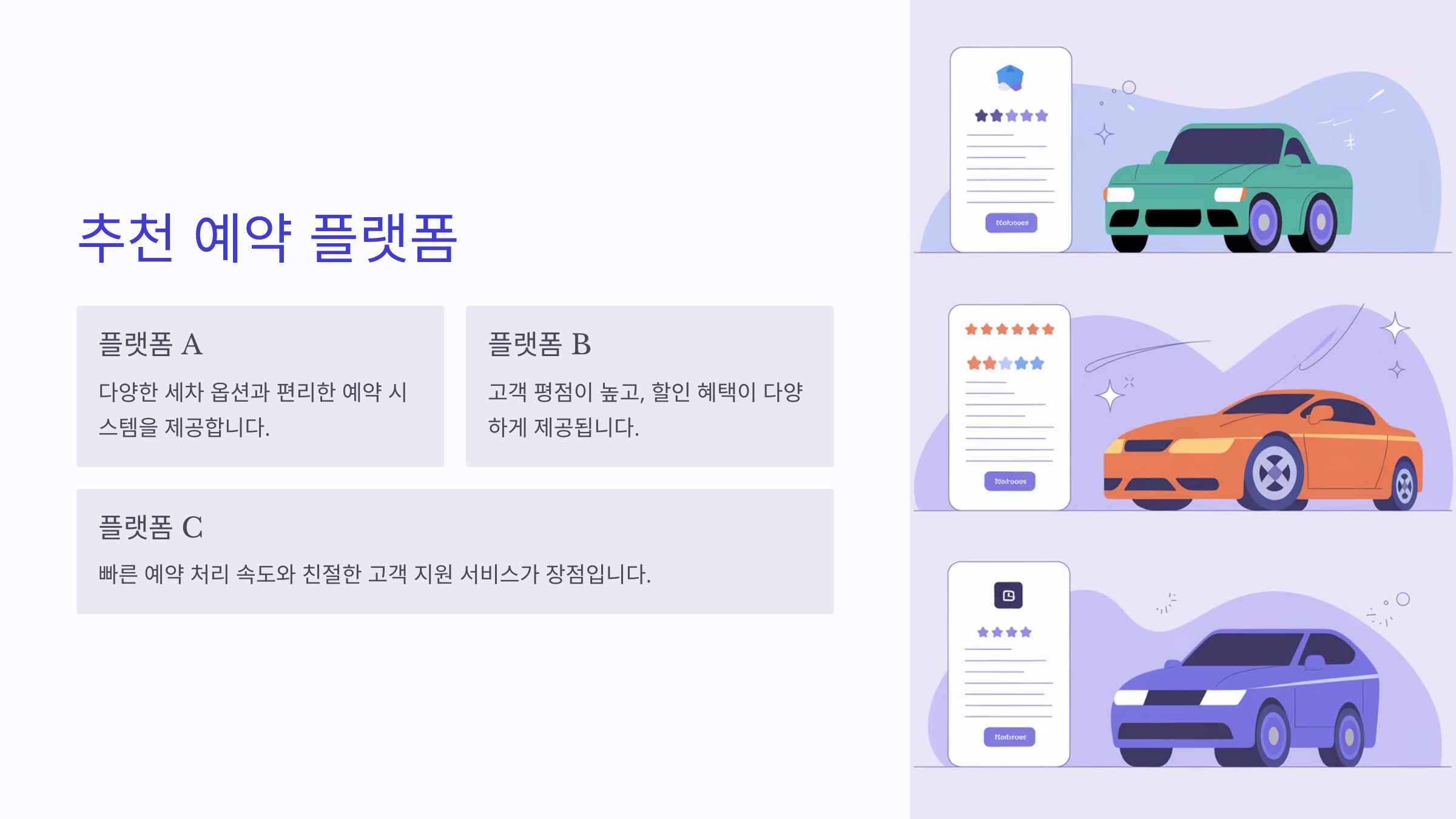 좋은 플랫폼을 고르는 가장 중요한 기준은 리뷰와 평점이에요. 서비스 이용 전에는 항상 다른 고객들의 후기를 참고해서 만족스러운 결과를 얻을 수 있도록 준비하세요.