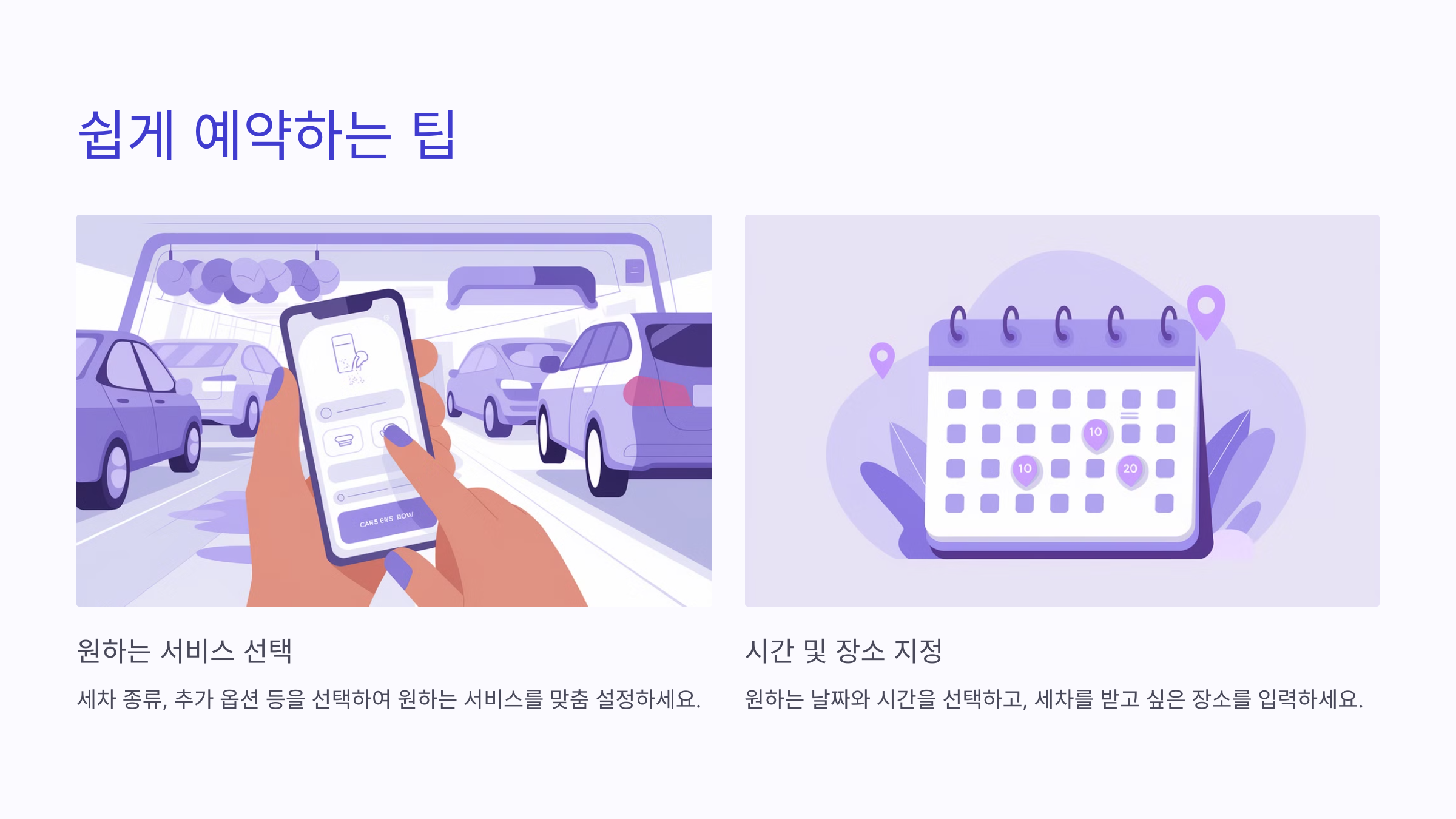 예약 화면에서 차량 정보를 입력하고, 세차 종류를 선택하세요. 기본 외부 세차뿐만 아니라 내부 청소, 왁스 작업 등 다양한 추가 옵션을 선택할 수 있어요. 선택이 끝난 후에는 원하는 날짜와 시간을 선택하면 됩니다.