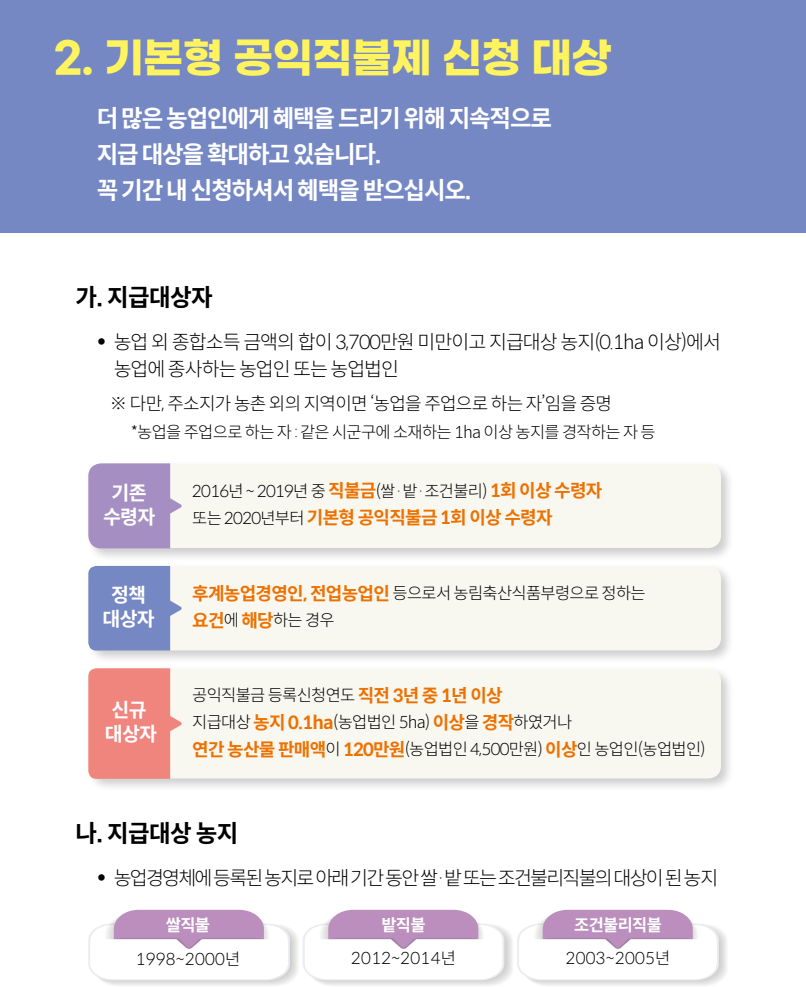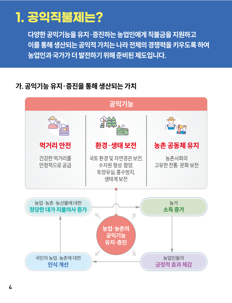 공익직불제는 농업·농촌의 공익적 가치를 유지하고 증진하기 위해 농업인에게 직불금을 지원하는 제도예요.