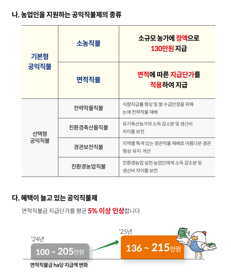 공익직불금은 면적직불금과 소농직불금으로 나뉘며, 2025년부터 면적직불금 단가가 평균 5% 인상될 예정이에요.