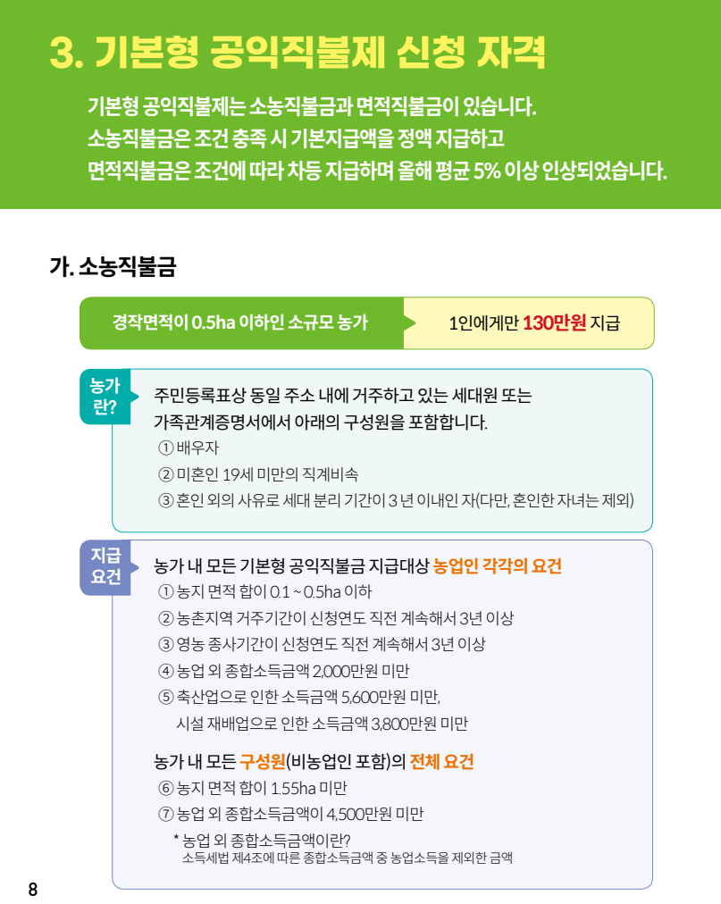 ✔ 0.5ha 이하 농지를 경작하는 소규모 농가에 정액 130만 원 지급